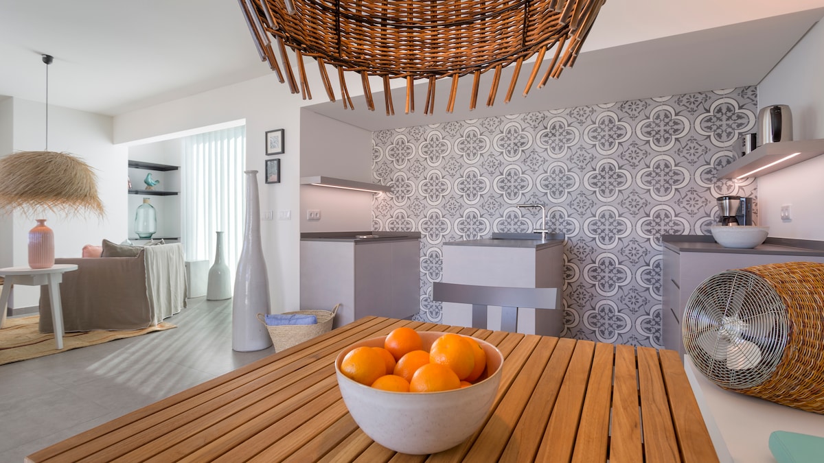 Rocas escarpadas y superficies lisas blancas, vidrio y madera, líneas rectas y formas orgánicas. Estéticamente inteligente pero sin pretensiones, privilegia la sensación de bienestar para el habitante. En armonía con la estructura del pueblo existente. Caiada en blanco, con azulejos con patrón y paredes expuestas de inspiración morisca, toldos de ropa de cama y pérgolas de madera. En la primera línea de mar, al final del camino peatonal, donde solo descansan los barcos de pesca.