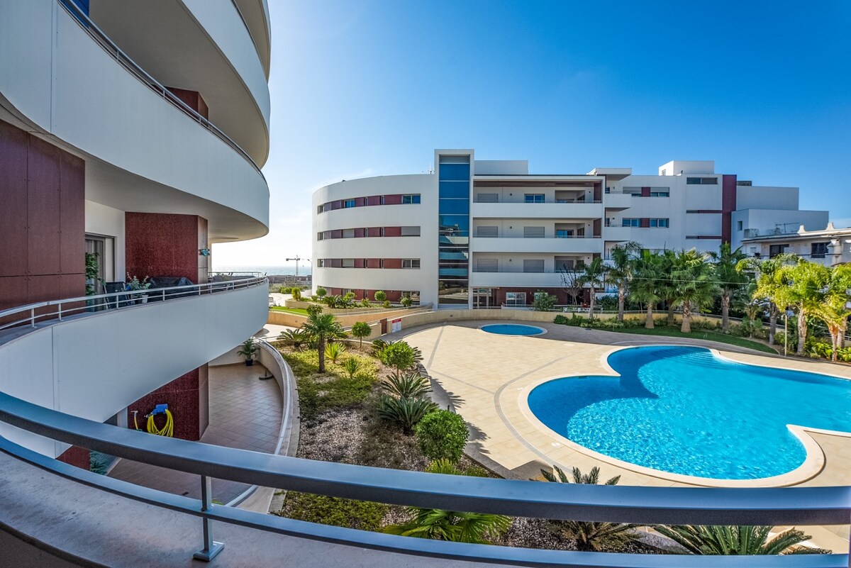 Apartamento moderno T3 con gran balcón y vistas panorámicas a la bahía de Lagos, en comunidad cerrada con 2 piscinas al aire libre y 1 piscina cubierta climatizada, sauna, baño turco, gimnasio, patio de juegos en la puerta para niños, con amplia sala de estar y cocina totalmente equipada, 3 dormitorios, 2 baños, aire acondicionado y estacionamiento interior con caja que incluye barbacoa.
