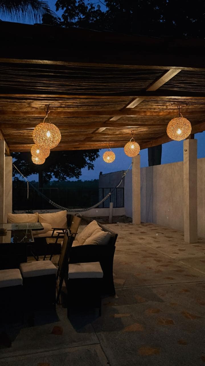 En este alojamiento se respira tranquilidad rodeado de naturaleza a solo 5 min. de la plaza San Joaquin que se encuentra sobre el periférico; ubicada en una privada con vigilancia y áreas verdes; cuenta con 3 recamaras, 5 camas, p/ hasta 8 huéspedes, 2.5 baños, sala, comedor, cocina con refri, micro, vinatera, estufa y utensilios básicos de cocina; sala con pantalla de 60", también cuenta con jardín y 1 amplia terraza con una sala cómoda y 1 barra con sillas .