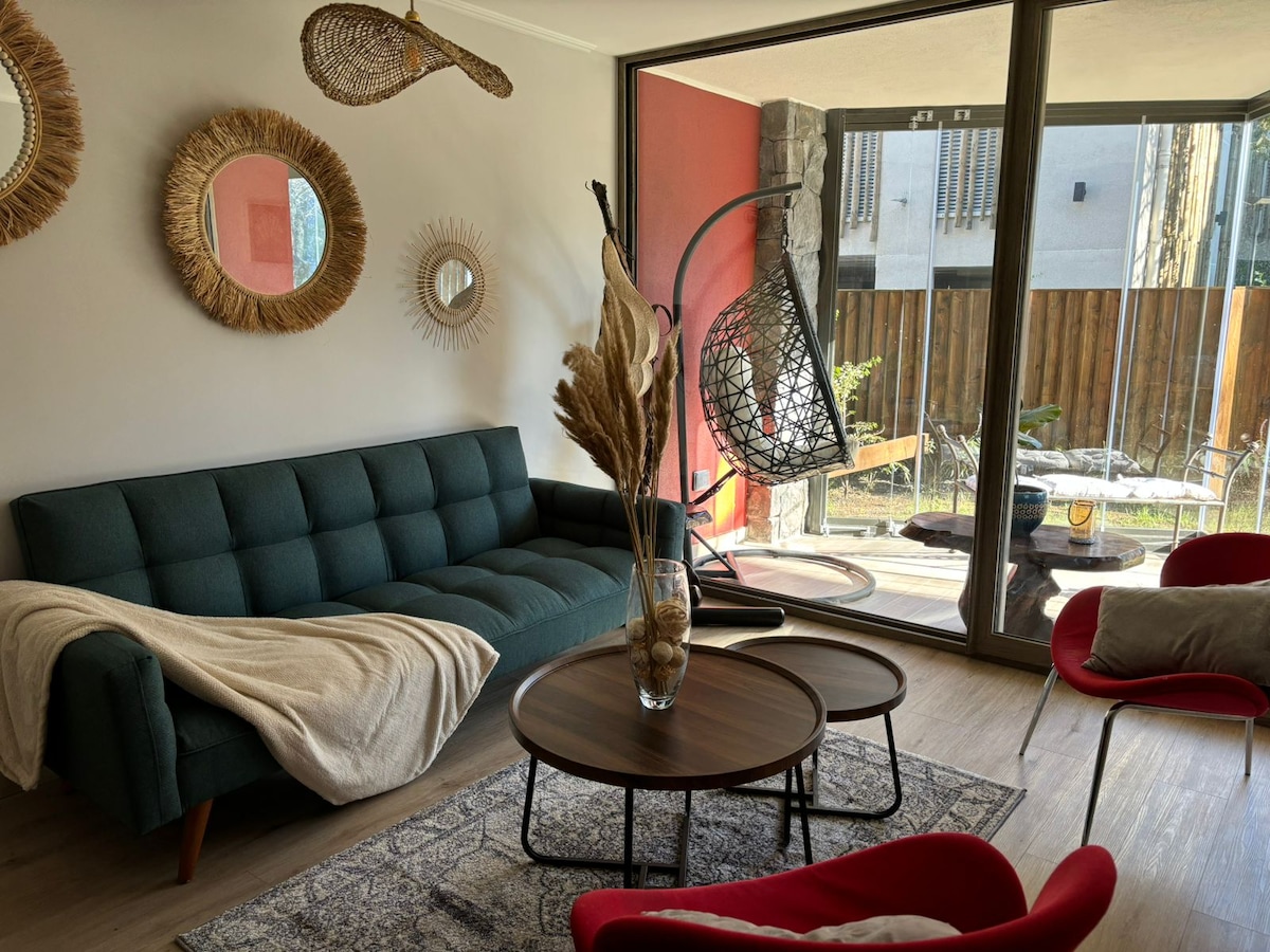 Disfruta de una experiencia con estilo en este alojamiento céntrico, el cual cuenta con 2 dormitorios y dos baños, cocina amoblada y completamente equipada. wi fi, piscina y estacionamiento. Especial para disfrutar de un momento de relajo en la hermosa ciudad de Pucon. Cercano a supermercados, terminal de buses, Restaurantes y el centro de Pucón.