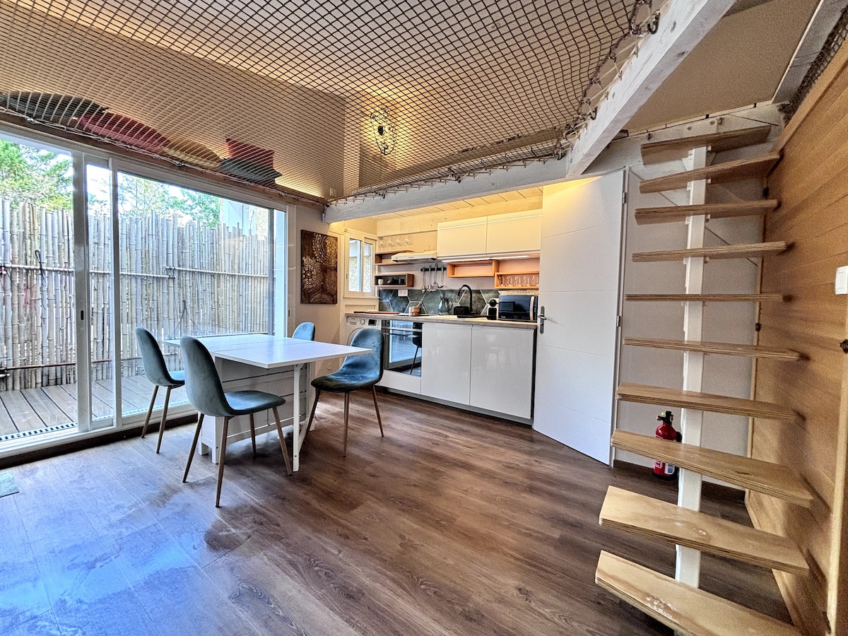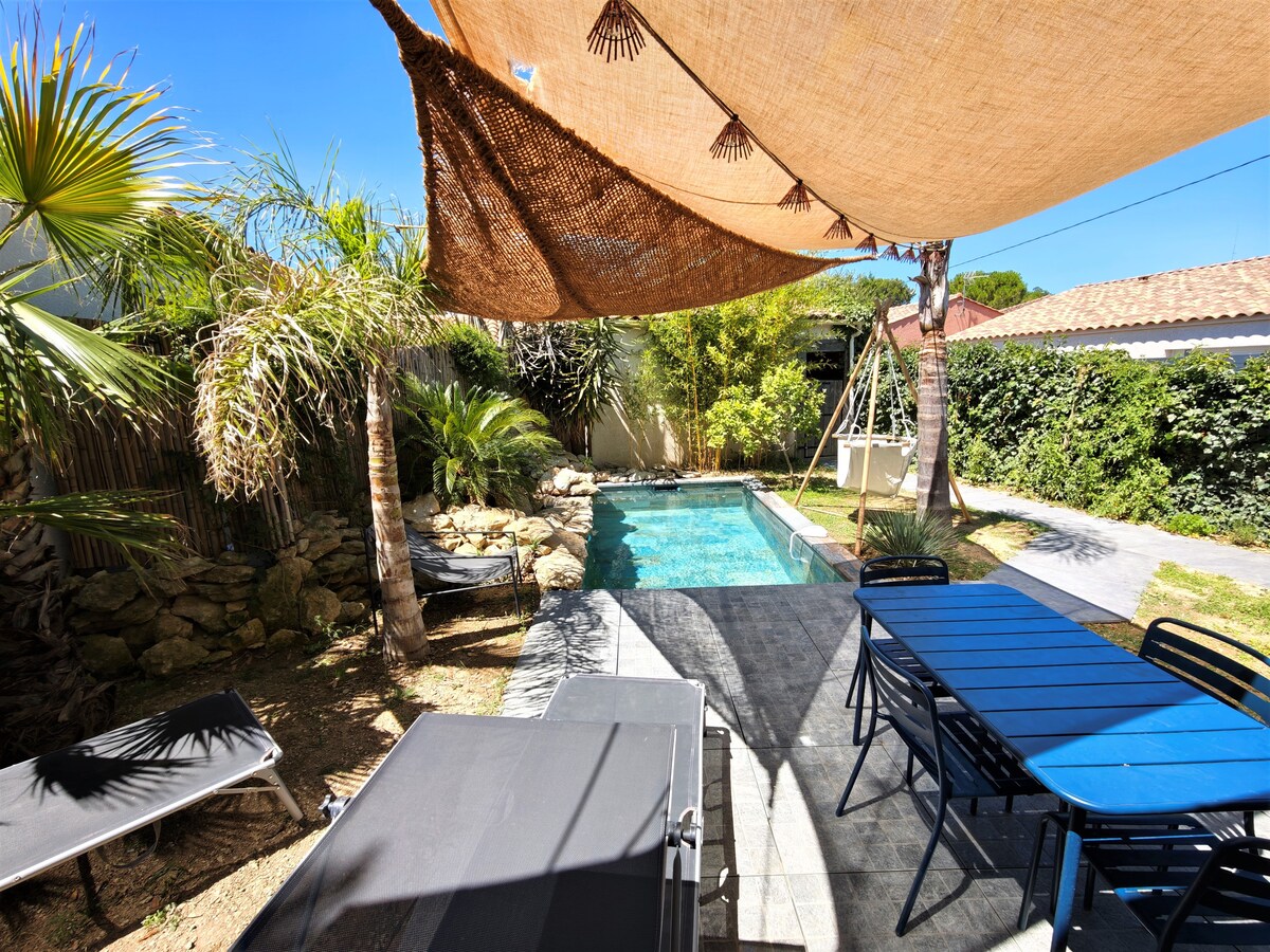 Casa de 42 m² con su jardín privado de 100 m² y 2 terrazas con horno de PIZZA. Una piscina privada de 10 m² climatizada con vistas a la terraza está reservada para usted en el terreno (sin restricciones de horario para el uso), un jardín mediterráneo está presente con palmera, cocotero, limonero, platanero y olivo. La casa tiene una cocina americana completa ( nevera, placa de inducción, hornos, lavavajillas, cafetera tassimo...), una mesa y 4 sillas.