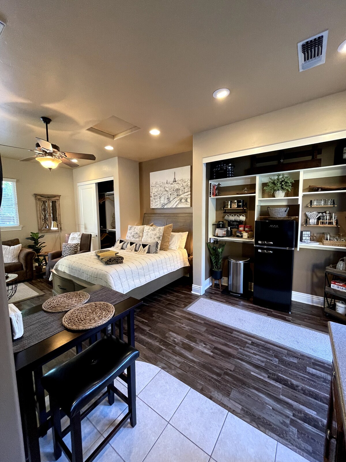 -Situated on a quiet street near 22nd and Park just 0.4 miles to the fairgrounds, 0.4 miles to Paso Market Walk, and 0.6 miles to the downtown square. -Sleeping for up to 2 guests + room for a pack-n-play. -Queen size bed offers a comfy 12" memory foam mattress. -50" Smart TV as well as ample closet space and black-out blinds. -Kitchenette provides everything needed to cook your own meals with a 2-burner electric cooktop, airfryer/oven, and microwave. -Spacious bathroom. -Large patio space.