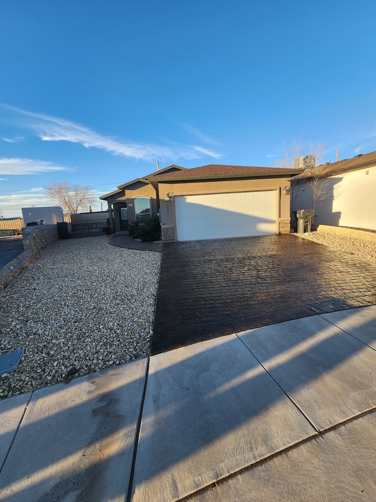 ¡Ven a alojarte en nuestra nueva casa! Hermosos tres dormitorios y dos baños con una amplia sala de estar. Disfruta de un buen descanso nocturno en la cama tamaño king ubicada en el dormitorio principal, que también tiene un escritorio para cualquier negocio que necesites atender. La casa se encuentra a pocos minutos del centro comercial Outlet y del centro comercial de nueva construcción.