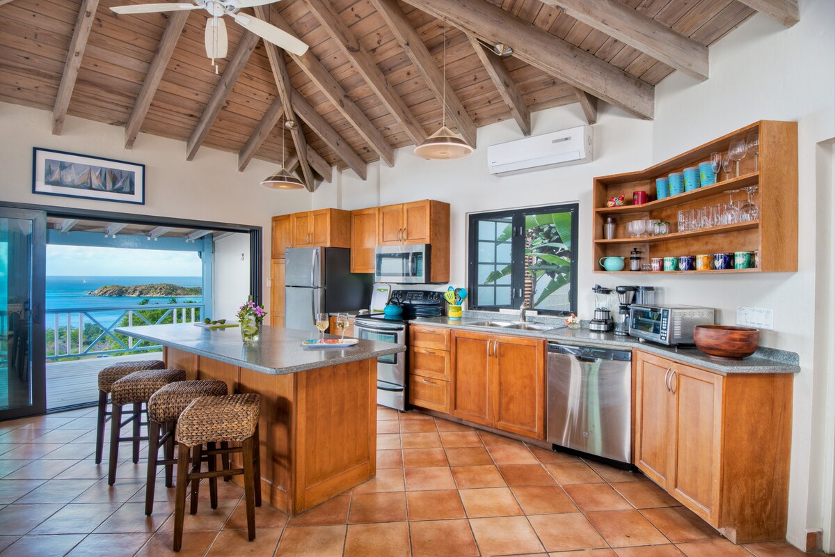 Esta fabulosa villa se encuentra en lo alto del prestigioso Belmont Estate, en el extremo oeste de las Islas Vírgenes Británicas de Tórtola. Al igual que su hermana menor Limeberry House, es el sueño de un diseñador con colores brillantes, azulejos mexicanos, lavabos de sol y luna que te despiertan incluso si has estado de fiesta hasta tarde en Bomba's Shack. La villa de estilo antillano de 4 dormitorios y 4 baños se encuentra en los contornos de la tierra, con dormitorios ubicados en cabañas separadas que mantienen la máxima privacidad. Todos los cuartos tienen aires acondicionados.