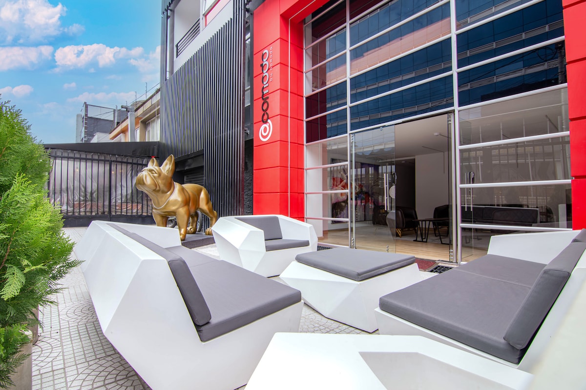 Vive una experiencia increíble en este nuevo Loft de lujo. Con acabados de diseñador, está equipado con una cama doble, WiFi, TV, microondas, waflera, cafetera, nevera, cocina, Escritorio, luz natural, una vista increíble y grandes comodities. Ubicado en un elegante edificio con excelente ubicación cerca de geniales restaurantes, centros comerciales, vías de acceso y transporte público. El edificio cuenta con cuarto de lavadoyplanchado, coworking, terraza 360, área de ejercicios y seguridad 24 h