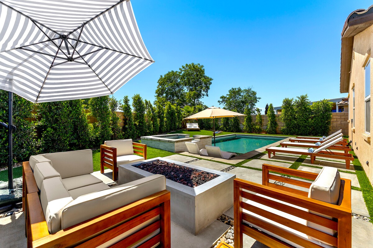 La Quinta Resort Living with Private Saltwater Pool, Hot Tub and a Fire Pit! This beautiful 3 bedroom 3 bath home (Lic# 65618) is perfect for a weekend getaway, festival weekends, or enjoying the beautiful desert weather for a few weeks while the snow accumulates back home. The large, open floor plan is very cozy and offers plenty of space for large groups or families. Located just minutes from Coachella, Polo Grounds, Old Town La Quinta, PGA West and countless other world class golf courses.
