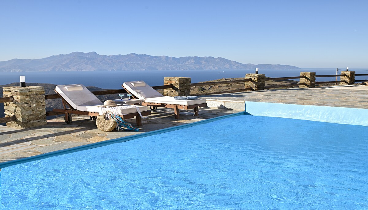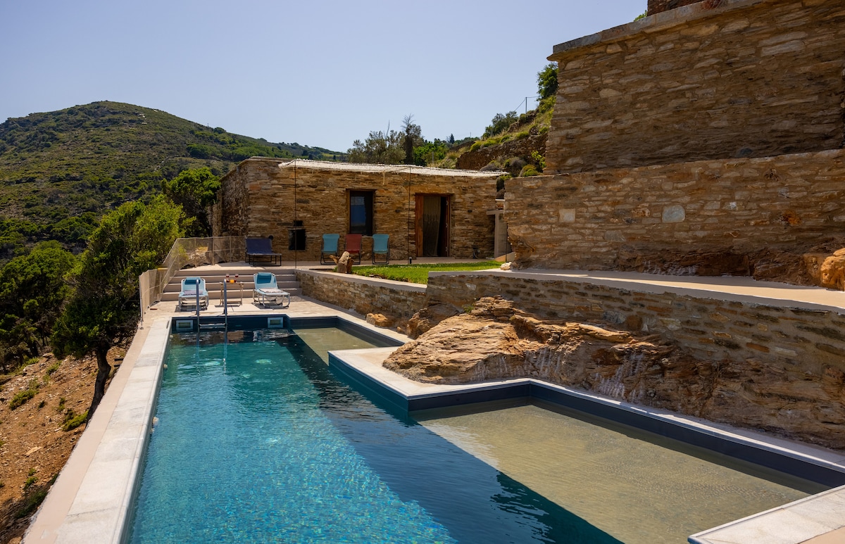 Bienvenido a Amoni, nuestro hermoso Airbnb frente al mar en la pintoresca isla de Andros, Grecia. Ubicado en medio de una impresionante belleza natural, Amoni ofrece un refugio tranquilo para los viajeros que buscan escapar de las exigencias de la vida cotidiana. Nuestra espaciosa y cómoda casa puede alojar hasta 8 huéspedes y cuenta con 4 dormitorios, cada uno con su propio baño privado, una cocina totalmente equipada y una acogedora sala de estar con camas tamaño king.