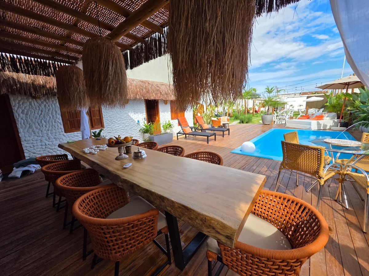 Casa pé na areia na Barra do Jucu, Vila Velha–ES, de estilo único, aconchegante e sofisticado. Arquitetura tipo cabana, com jardim ornamental, redário, ducha externa e piscina com deck e móveis de sol. Área gourmet completa, ideal para preparar moqueca capixaba, com churrasqueira e opção de fogo de chão para os dias frios. Próxima ao comércio local, à Praia da Concha (mar calmo para crianças) e a poucos minutos de Guarapari.