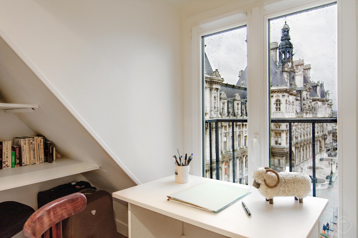Un apartamento hermoso y acogedor en el corazón de París con una vista asombrosa de la catedral de Notre Dame, la plaza principal del Hotel de Ville y la Torre Eiffel a lo lejos. Recientemente reformado en 2014, este moderno apartamento cuenta con un dormitorio, cocina totalmente equipada, baño, una amplia sala de estar y dos pequeños balcones.