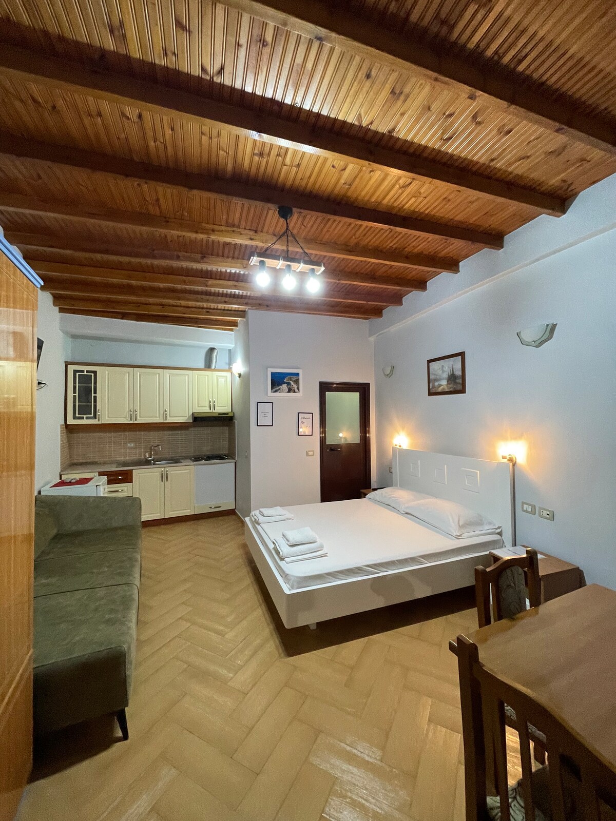 Relájate en este espacio tranquilo y elegante. Nuestro apartamento está recientemente amueblado teniendo en cuenta la necesidad de todos los viajeros para relajarse y relajarse. Tiene una ubicación céntrica en un barrio antiguo y tranquilo de Vlora, a 3 minutos a pie del barrio de Muradie recién reconstruido y justo enfrente de la parada de autobús interurbano, lo que lo hace perfectamente conectado y sin complicaciones. La sala de estar tiene un sofá hecho a medida y una pequeña cocina, totalmente equipada para cocinar y disfrutar de comidas cálidas con vistas.