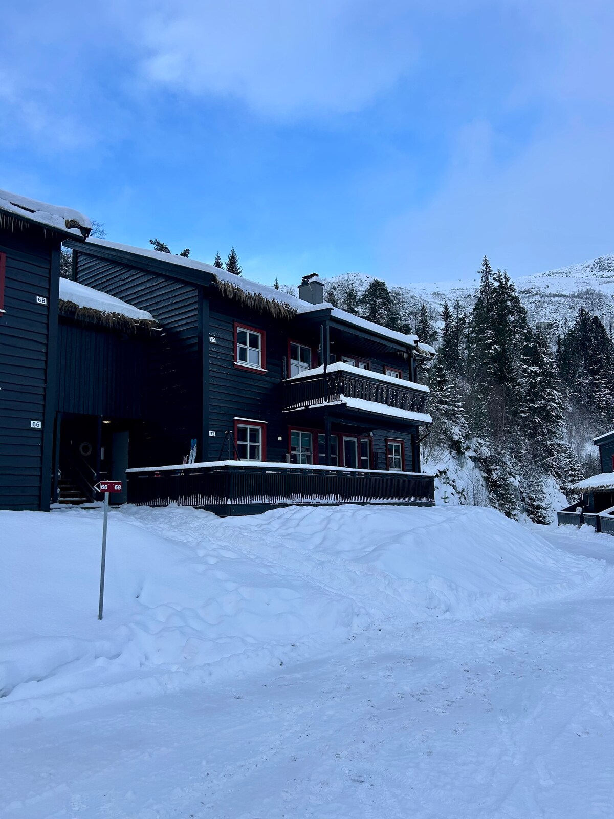Te damos la bienvenida a un gran resort de lujo en las montañas. Ubicación atractiva para hacer senderismo y una gran variedad de deportes. A 10 minutos del centro de Voss. • Entrada/salida de esquí • WIFI de alta velocidad y TV. • Conduce hasta la puerta • 7 camas/3 dormitorios - 2 baños con azulejos, ducha tropical, sauna. • Calefacción en todos los pisos, como dormitorios. • Cocina de madera • Cocina totalmente equipada con horno, micro, inducción. lavavajillas, nevera y congelador. • Terraza y balcón cubiertos • ¡Vista panorámica! - Sol desde la mañana hasta tarde por la noche.