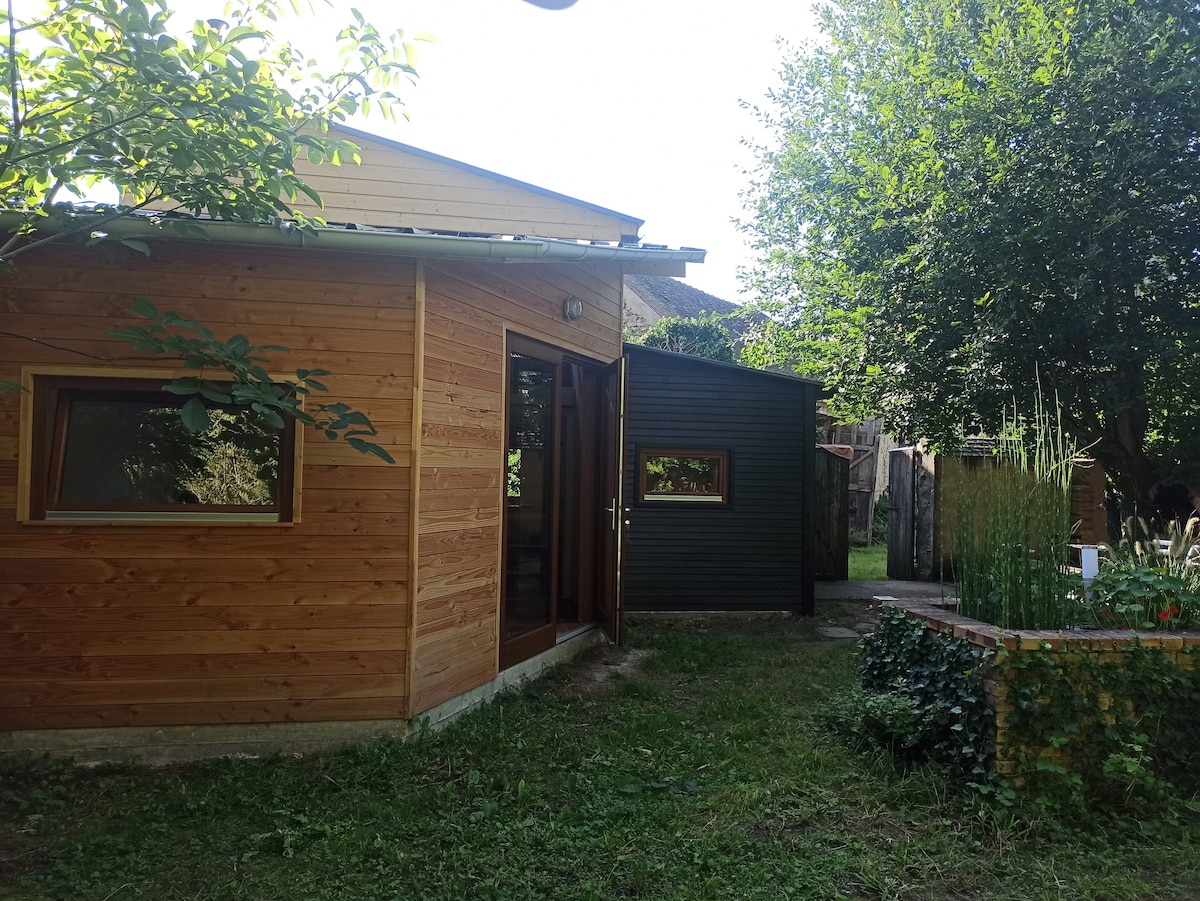 En un entorno verde, pequeña casa independiente en 2200 m2 de jardín, detrás de la carretera, al borde de un bosque, en el mismo terreno que los anfitriones. Le damos la bienvenida a nuestro hermoso paraíso de flores, nuestro remanso de paz le espera. Vivienda de 2 habitaciones , una lavabo y 2 camas muy cómodas que se juntan para parejas , la otra sala de estar, comedor y cocina con 2 camas, incluyendo cama nido que hace que el sofá muy cómodo. Una ducha separada , un baño separado.