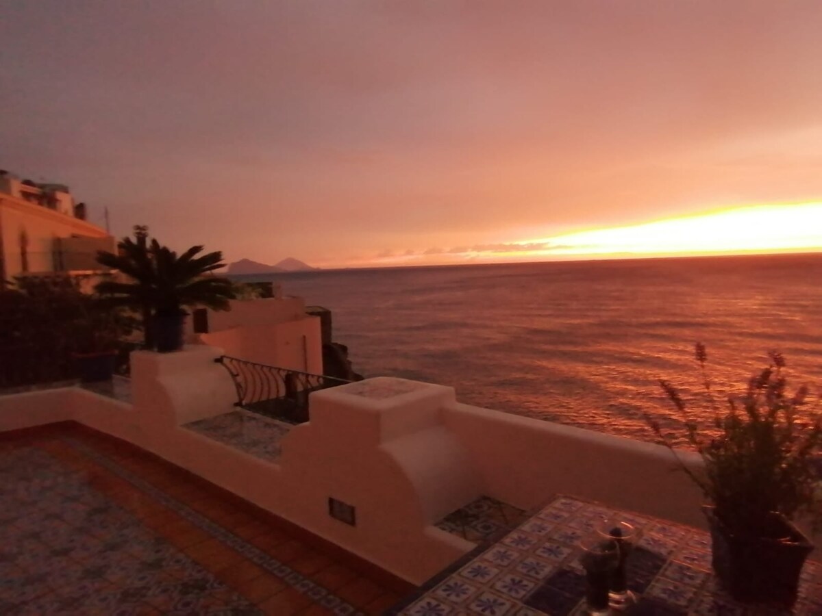 L appartamento facente parte della casa dove vive la sola proprietaria composto da una grande camera con un letto matrimoniale divisibile,aria condizionata, un antibagno, un bagno completo con una doccia, una cucina attrezzata di tutto il necessario, divano e. televisione. Inoltre un grande terrazzo a picco sul mare con una parte coperta per pranzo e relax ed una meravigliosa vista su panarea e stromboli Una scala privata porta alla bellissima baietta sottostante con un mare meraviglioso.