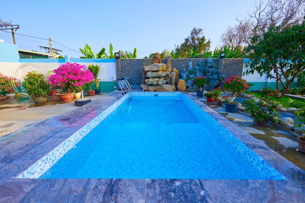 La villa tiene casi 2000 m2 con ascensor exterior. - Piscina electrolítica de sal de 100 m2, la misma área de jardín ideal - Sala de fiestas separada con mesa de billar y karaoke moderno, que te da una pasión por cantar sin tener que limitar el sonido. - Cocina completa: cocina de inducción, horno, nevera... - Ubicación conveniente: cerca del mercado de mariscos frescos, famosos restaurantes y atractivas atracciones turísticas. - Capacidad flexible: la villa incluye 8 dormitorios, 9 camas tamaño king, 10 baños y colchón adicional, estándar para 18 huéspedes.