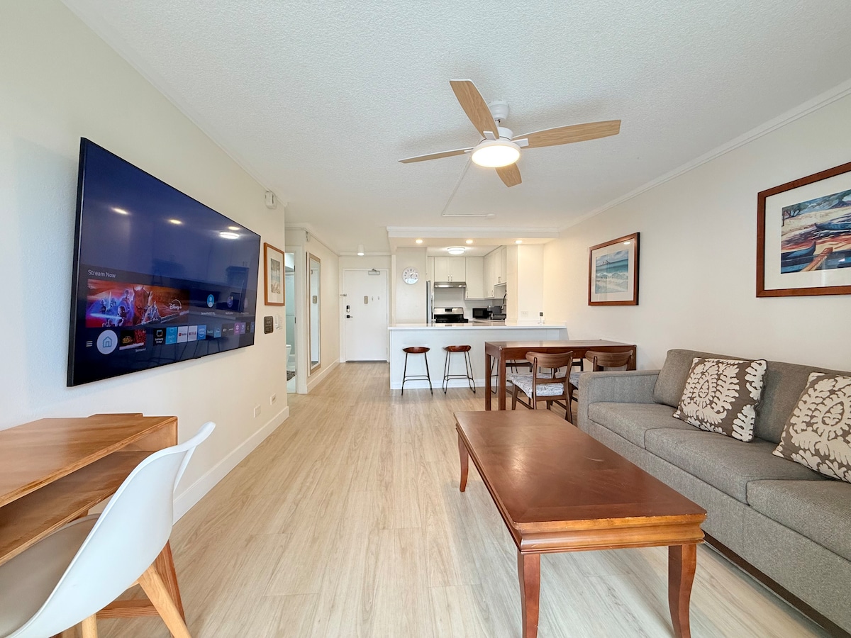 Excelente ubicación en 2464 Prince Edward St, corazón de Waikiki, a 3 minutos a pie de la playa de Waikiki. Esta unidad de la novena planta tiene balcón y vista parcial al mar. 1 cama tamaño queen, 1 sofá cama tamaño queen, 1 baño y 1 cocina de tamaño completo, 2 aire acondicionados de ventana, wifi de alta velocidad, 2 televisores inteligentes (70” y 55”), bidé de agua fría. Hay un sinfín de tiendas, restaurantes y actividades a poca distancia a pie. Tanto si quieres relajarte en la playa como disfrutar de la vida nocturna, ¡todo está a la vuelta de la esquina!