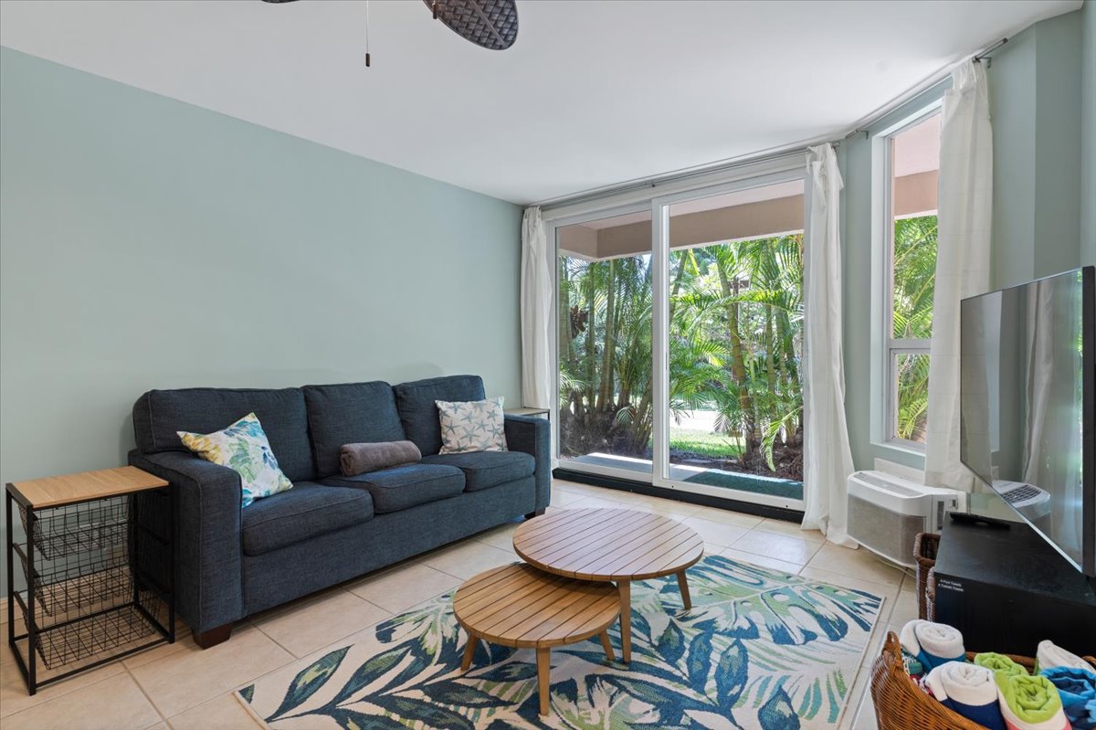 Amplio apartamento en un hermoso centro vacacional, 850 pies cuadrados. Entrada privada en la planta baja, lanai privado y jardín, así como un patio privado amurallado, que crea brisas cruzadas relajantes. Jardín de un millón de dólares al año, a unos pasos de la piscina, la cascada y el spa. Al otro lado de la calle se encuentra el embarcadero y las mejores playas. 2 baños completos y 2 sofás cama permiten que la sala de estar sirva como un segundo dormitorio. Disfruta de un sueño tranquilo lejos del tráfico de coches/peatones. Fácil distanciamiento social. Se proporcionan tumbonas, sombrilla, toallas y equipo de esnórquel.