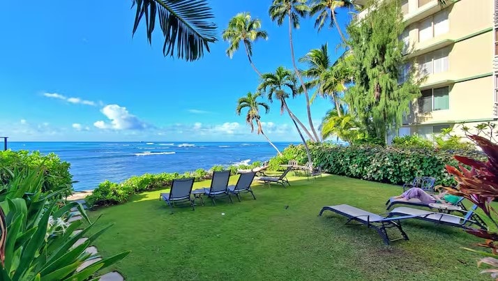 Hipnotizantes vistas al atardecer desde este apartamento frente a la playa de arena. Nada te separa de las aguas turquesas brillantes, salvo las huellas en la arena. El balcón tiene la altura ideal para observar tortugas. De noviembre a abril puedes ver una ballena. Esta vibrante tierra está llena de sorpresas. Incluso los delfines pasan por aquí de vez en cuando. Escapa de las multitudes de Waikiki para experimentar un verdadero estilo de vida hawaiano. Haz esnórquel, boogie board o surf justo fuera de tu puerta. Despertar al ritmo del océano puede cambiar tu vida para siempre.