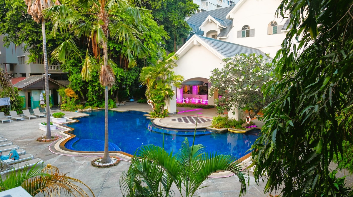 El Mido Hotel Pattaya está en una zona tranquila y conveniente de Pattaya, lejos del tráfico y el ruido, con un ambiente relajado y acogedor.El hotel cuenta con una espaciosa piscina al aire libre rodeada de vegetación tropical y arquitectura tradicional tailandesa, creando un ambiente tranquilo similar al de un centro vacacional.La zona común es abierta y cómoda, con tumbonas y asientos con sombra junto a la piscina, adecuados para relajarse todo el día.El hotel es tranquilo y cómodo, y también es muy conveniente para ir a la playa de Pattaya, centros comerciales, restaurantes y varias atracciones. Es una opción ideal tanto para la comodidad como para la conveniencia.