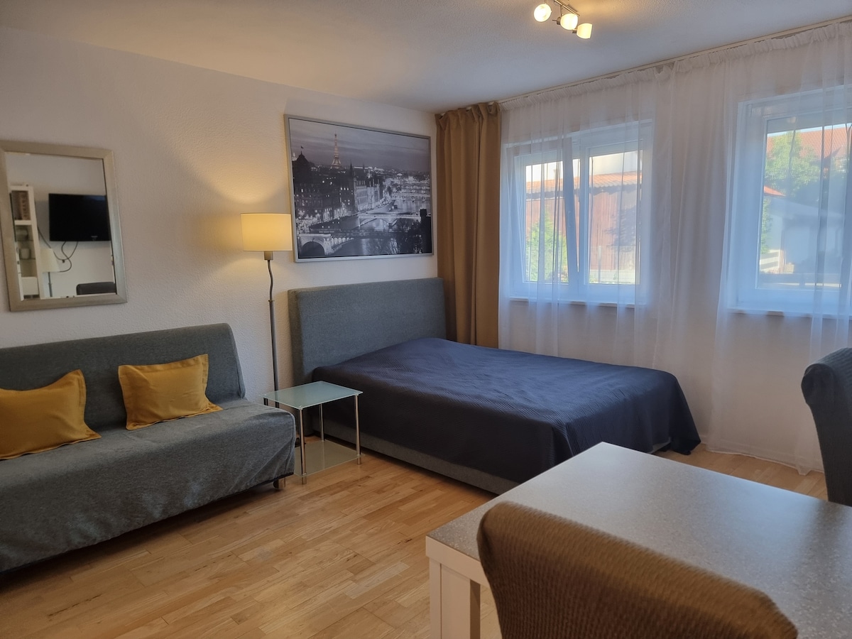 Hola, queridos huéspedes: Os ofrecemos un estudio con ducha, inodoro y sauna. La habitación dispone de: - Cama doble + cama individual - Televisor con HDMI, puertos USB (posible para discos duros con películas) - Armario - Placa de cocción - Microondas con función de horno de convección - Hervidor - Cafetera - Nevera - Sauna - Jardín Enfrente hay un supermercado (Rewe, abierto de lunes a sábado hasta las 22:00) y una panadería en el Rewe que también vende pan fresco los domingos.
