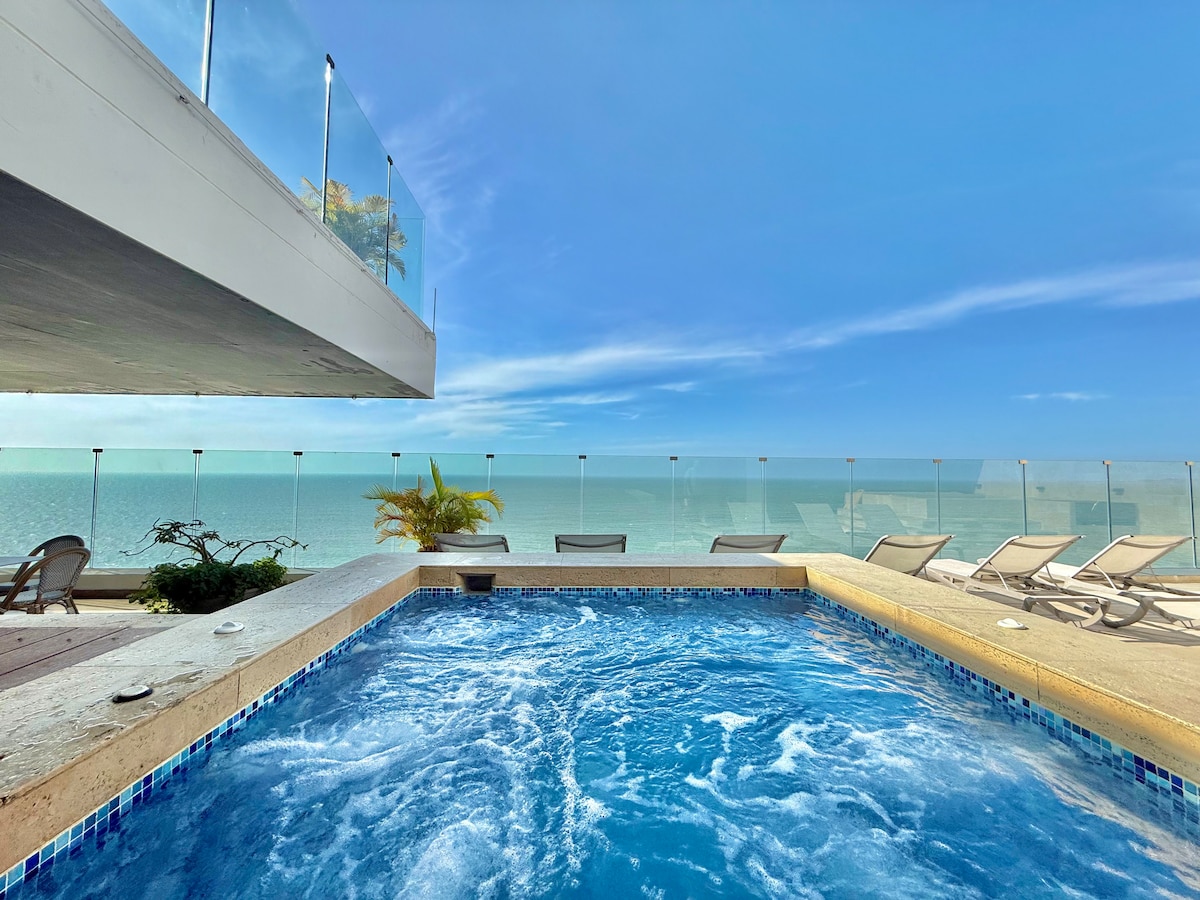 Hermoso y espacioso penthouse con vista espectacular, frente al mar . Localizado en la mejor playa de la zona turistica El Laguito, diagonal al Hotel Dann Cartagena. Saliendo del edificio encuentras parques, restaurantes, deportes acuáticos, supermercados, farmacias, estación de taxis, cafe Internet . EL apto tiene A/C en las habitaciones, TV en todas las areas, wifi, Agua Caliente en los banos, La cocina esta equipada con todo lo esencial .