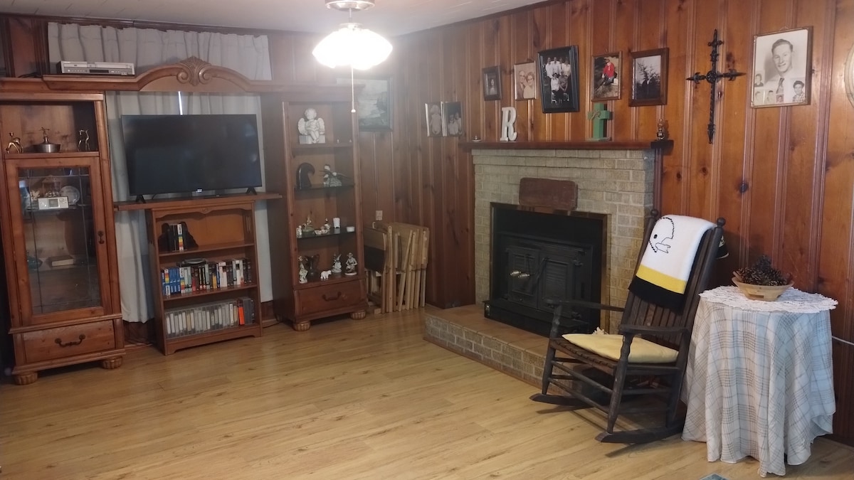 ¡Es una casa antigua en el campo con mucho carácter y muy acogedora! ¡No es una SUITE DE HOTEL! Si buscas paz y tranquilidad, aquí lo tienes... :) También tengo cosas a mano por si necesitas algo... sábanas adicionales, artículos de baño, condimentos de cocina y especias... También tengo un colchón hinchable extra de tamaño completo y una cuna portátil. Todo tiene wifi, no hay cable, solo televisores y reproductores de DVD. Hay 3 televisores inteligentes y 1 televisor normal. Todos tienen Roku.