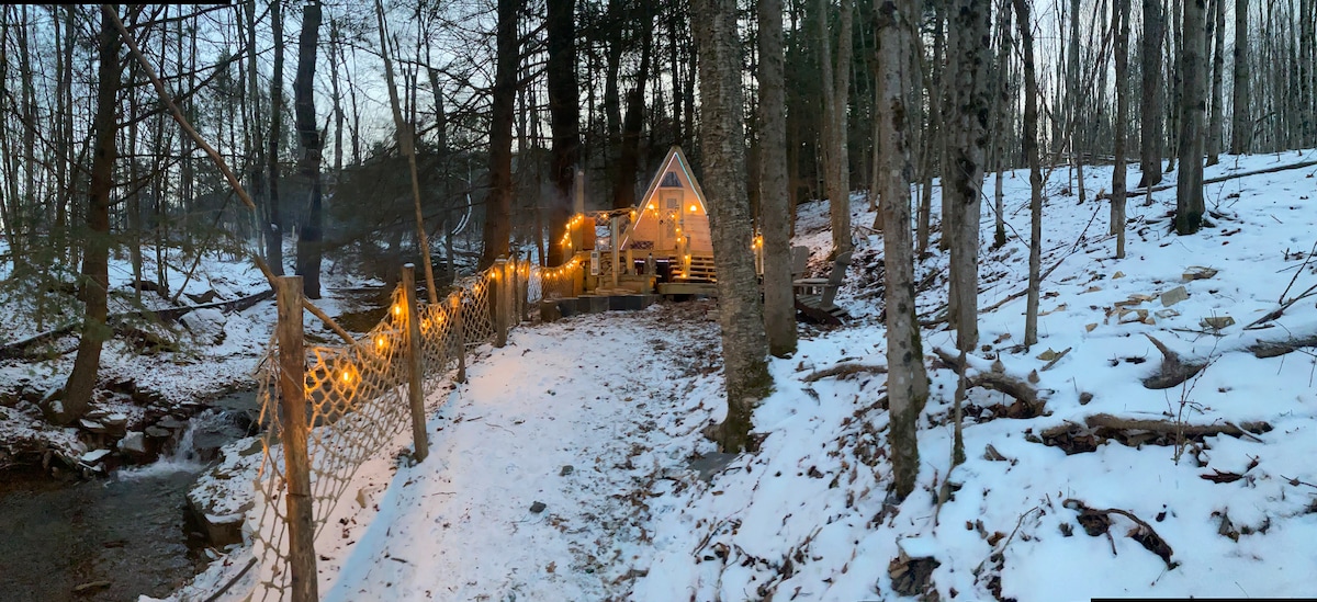 Nuestra acogedora cabaña con estructura en A se encuentra entre árboles Hemlock y a unos pasos de una cascada de 30 pies. Situada en 33 acres privados conectados a tierras estatales, disfruta de las vistas de la cascada mientras bebes café frente a la chimenea. La casita fue diseñada intencionalmente para sentirse como en casa lejos de casa. En verano, refréscate en las cascadas y arroyos privados, en otoño disfruta del impresionante follaje y en invierno esquía/haz snowboard en Belleayre (a 25 minutos). La pesca en el lago Alder y en el embalse de Pepacton está a 10 minutos en coche.