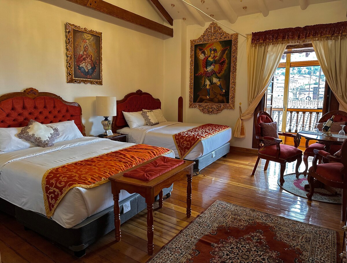 Suite de lujo con 2 camas king size(extra grande) , 1 cuarto de baño con tina francesa y ducha, ventana con vista al Qorikancha.