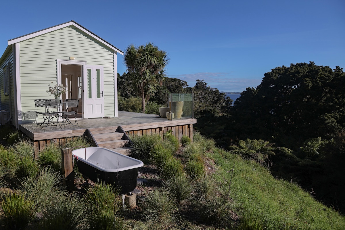 Ubicación privada y perfecta; playa y viñedos a tu alcance. Orientado al norte y acogedor. Una de las viviendas más antiguas de la isla; la cabaña original del herrero de alrededor de 1892 revivió para que los huéspedes sigan amándola. Come y bebe tu camino; la elección de un romántico amante del vino y la comida. Popular para parejas de luna de miel, amantes de la playa, caminantes, escritores y todos los que aprecian las buenas vibraciones, el sol y el mar. Vistas de los viñedos, cruza la carretera para ver la playa de Onetangi a solo 5 minutos a pie; una playa superior de Nueva Zelanda; escucha el mar.