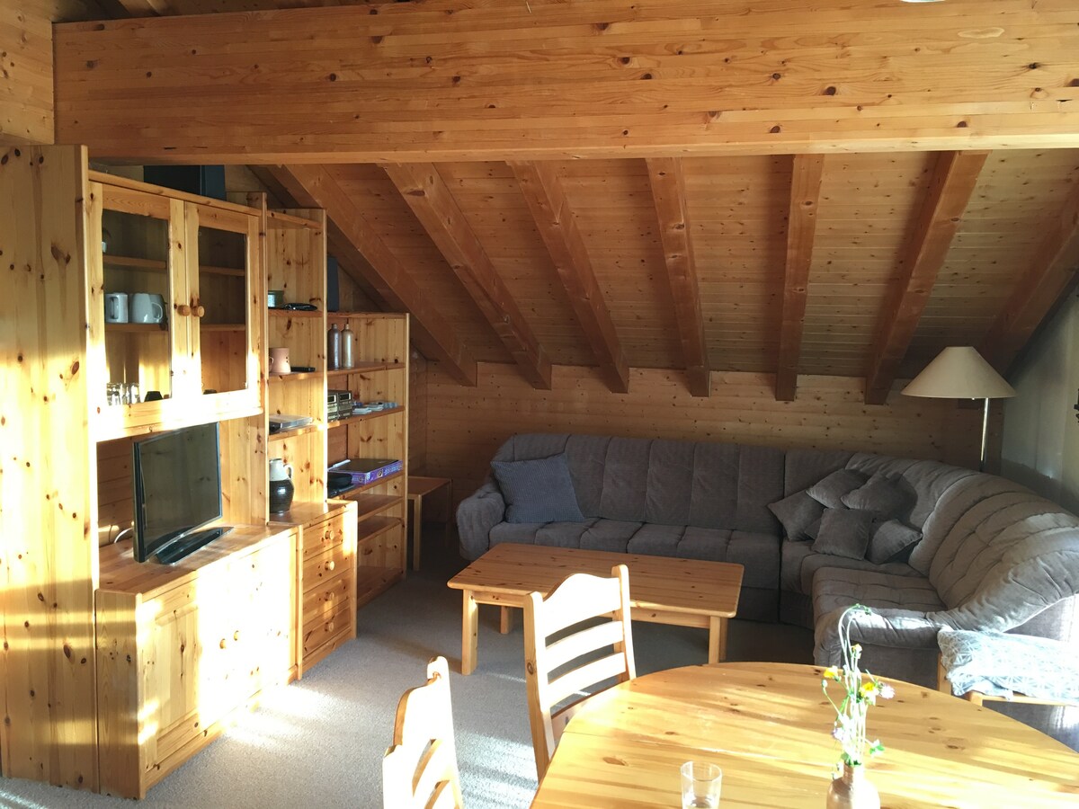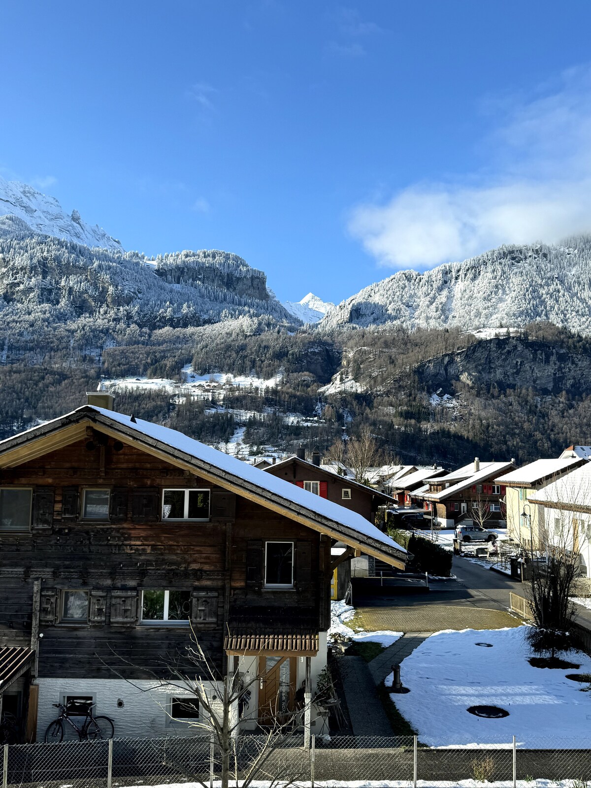 Apartamento bastante acogedor y renovado en una casa de madera más antigua de 3 familias, cocina y ducha sencillas, Especialmente para parejas casadas, amantes. Gran jardín con casa de campo de fondue para noches acogedoras. estacionamiento gratuito junto a la casa A 7 minutos caminando de la estación de tren. A 2 minutos de la parada de autobús de esquí que te llevará a los teleféricos. Wellcome Nos vemos pronto.