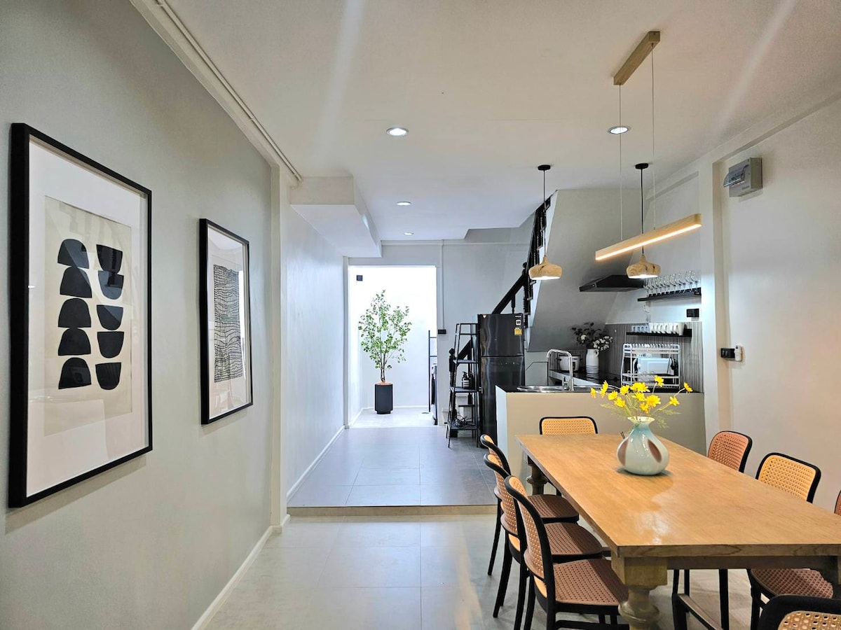 Disfruta de tu estancia en el centro de Bangkok en este acogedor y elegante lugar. Una casa de 160 metros cuadrados, recién renovada, que ofrece a grupos y familias un espacio agradable. Cuenta con todo lo necesario para que te sientas como en casa, incluyendo 1 cama tamaño queen, sala de estar (sofá cama), 2 baños, wifi, Netflix, lavadora y secadora, espacio de trabajo y una cocina bien equipada. A solo 5 minutos a pie de la estación de metro Ratchadaphisek. Fácil acceso a 7-11, bonitas cafeterías y mercados famosos como Jodd Fair, el mercado de Chatuchak, etc.