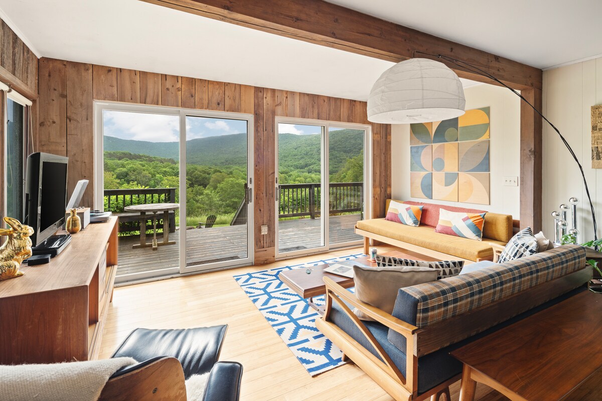 Esta casa de campo de Catskill está situada en 12 acres aislados con impresionantes vistas a la montaña y al valle. La casa principal cuenta con tres plantas bien equipadas con dos dormitorios en la planta baja, un dormitorio principal con baño privado en la planta superior y una estufa de leña en la planta principal. La propiedad también cuenta con un estudio independiente con un gran patio de piedra, chimenea, jacuzzi de cedro, estanque y un pintoresco sendero forestal más allá. ¡Cerca de esquí, senderismo y golf!