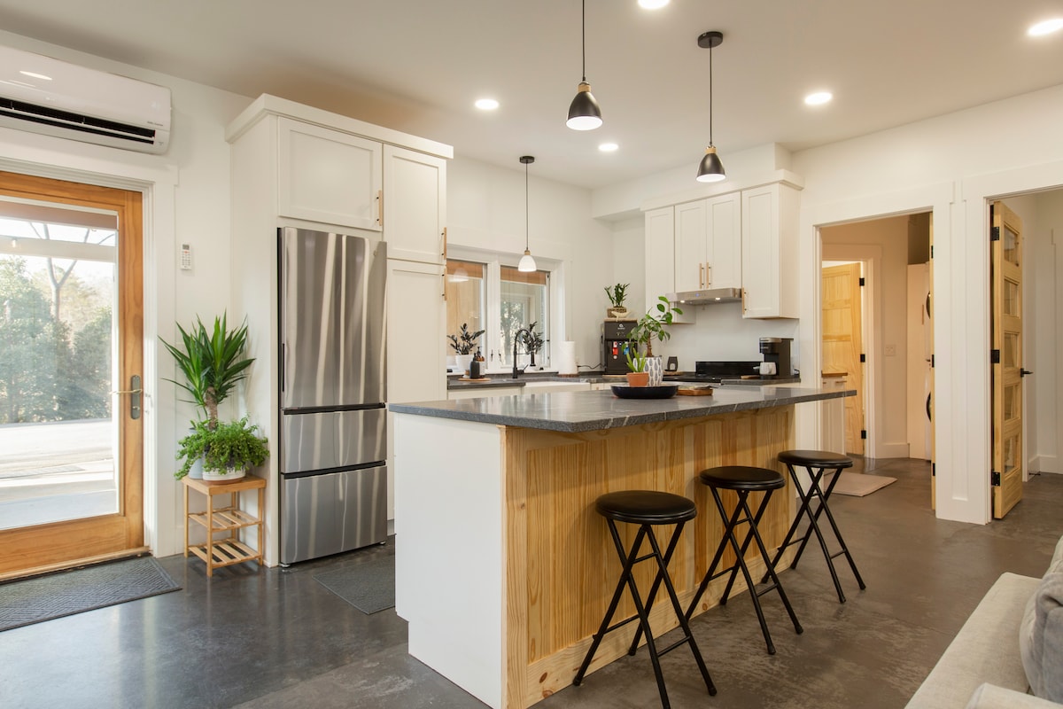 The Madera Madre - the “mother wood” gives life to the visceral vacationer and warmth to the weary traveler. Settle in with ease to your home away from home, nestled in a quiet neighborhood just a 5 to 7-minute drive from downtown. This private dream pad is the ideal hub for couples, friends, and family to explore everything Asheville. Recharge in the high-end Serta iComfort® bed with adjustable frame for an unbeatable night’s sleep! Fully equipped kitchen. Professionally cleaned!!
