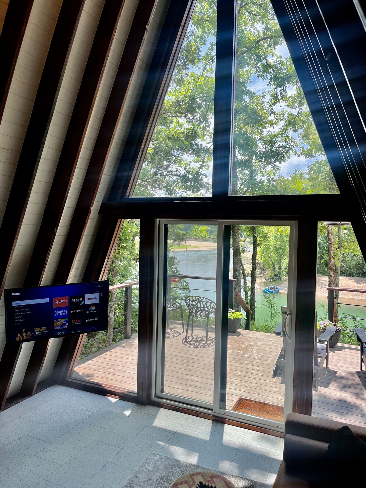 Modern, brand new a-frame cabin on the river. Overlooks the peaceful Illinois river. Watch the floaters go by from the comfort of your deck. The cabin is luxurious with all the modern amenities, hot tub professionally maintained, fast wifi and Roku TV. This is the perfect place to sneak away with a loved one for a long weekend on the river. By day you watch the constant stream of floater and kayakers, by early evening it’s the wildlife’s turn with eagles, owls and crane take over the banks.