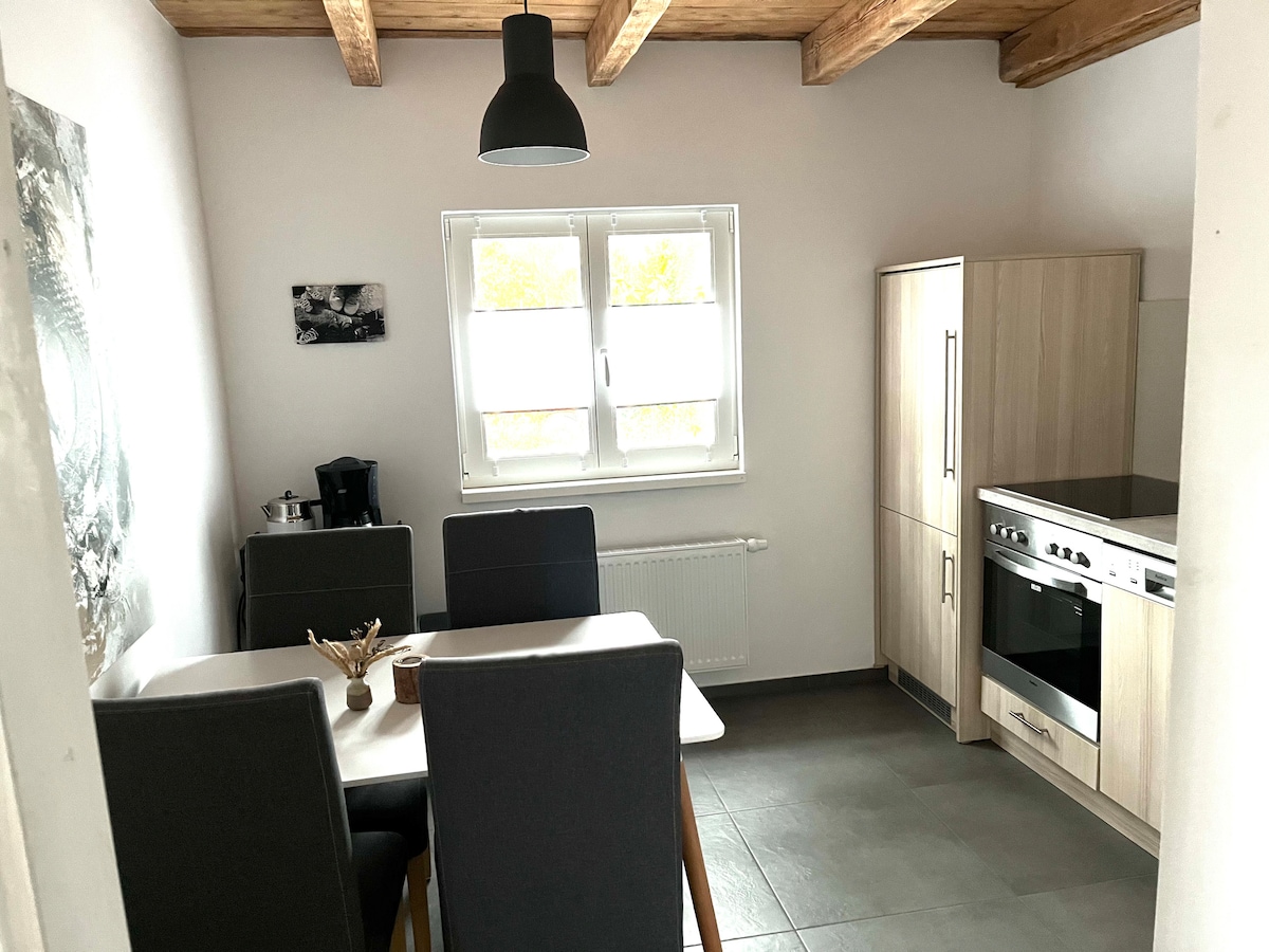 Wir freuen uns euch in unserer kleinen Wohnung willkommen zu heißen! Die Wohnung umfasst ca. 45qm. Im Schlafzimmer befindet sich ein Doppelbett (140x200). Weitere Schlafmöglichkeiten stehen mit dem Schlafsofa (180x200) im Wohnzimmer zur Verfügung. Die Wohnung steht euch alleine zur Verfügung. Wir als Gastgeber wohnen im Haupthaus nebenan und stehen euch für Fragen persönlich oder per Telefon zur Verfügung. Ein Parkplatz befindet sich direkt vor der Wohnung.