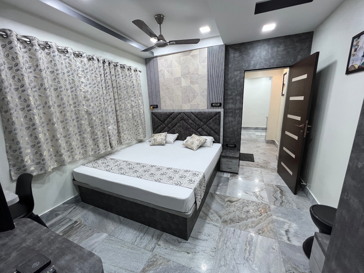 Disfruta de una estancia inolvidable con tus seres queridos en este apartamento 3BHK totalmente amueblado y céntrico en el corazón del sur de Calcuta, con una decoración elegante y moderna. 🛏 Capacidad para 4 personas | 3 dormitorios | 2 baños 📍 A solo 500 m de Gariahat Televisión 📺 inteligente con Netflix, Prime Video 🛗 Primer piso con ascensor Servicio de limpieza 🧹 diario incluido ✅ Exclusivamente para familias No se permiten hombres🚫 solteros ni parejas no casadas. Cocina 🍽️ modular con utensilios, horno, microondas y nevera ❄️ Todas las habitaciones tienen aire acondicionado para tu comodidad.