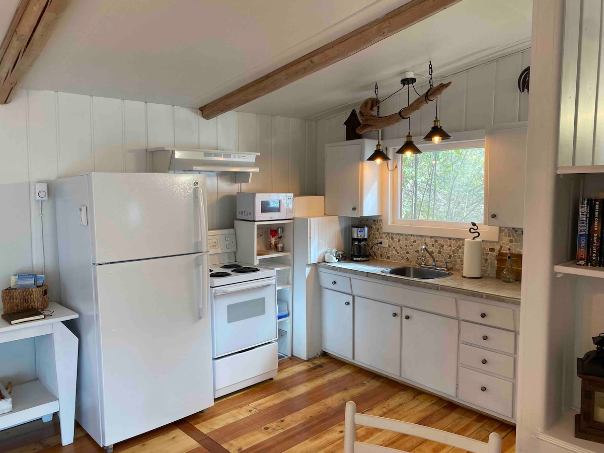 Nuestra suite de invitados tiene un ambiente rústico moderno y puede alojar a 3 huéspedes. Hay un baño privado y una habitación separada con microondas, placa eléctrica, sandwichera para desayunar, mininevera, cafetera Keurig y tetera. Hay platos, tazones, cubiertos, etc. y una mesa de comedor rústica de barril de vino. Los armarios están abastecidos con té y café locales, con crema en la nevera y refrigerios. También hay una parrilla para uso de los huéspedes.