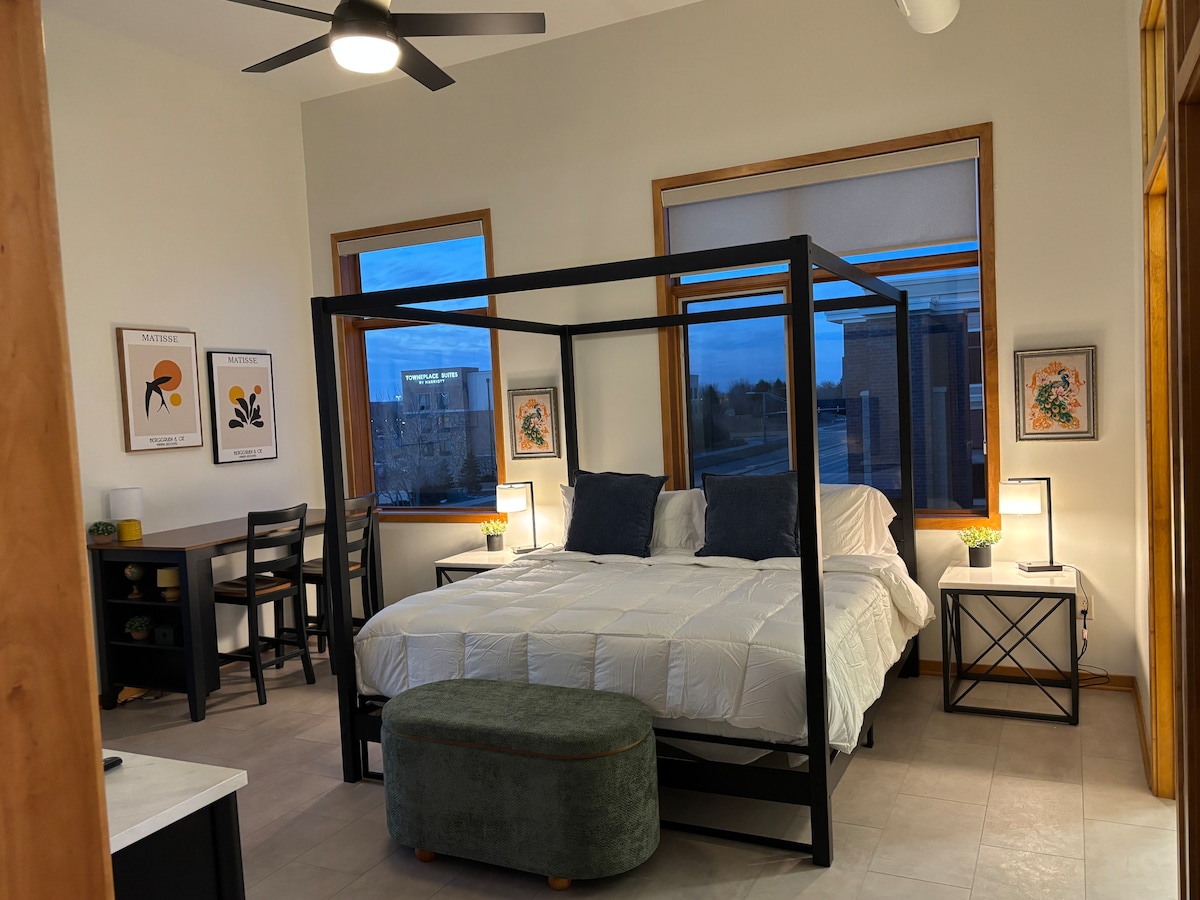 Esta unidad final de 2 dormitorios y 2 baños está llena de luz natural. Un lugar perfecto para viajeros de negocios o familiares. Este espacioso diseño te dejará mucho espacio para respirar. Cuenta con una isla/barra de desayuno de gran tamaño, lavandería de tamaño completo, cama tamaño king, 2 camas completas y una amplia sala de estar. Ven a disfrutar de tu próximo hogar lejos de casa y déjanos hacer el resto. Esta unidad también cuenta con un garaje para un coche y estacionamiento ilimitado, wifi de alta velocidad en la unidad con YouTube TV de cortesía y cocinas listas para el chef.