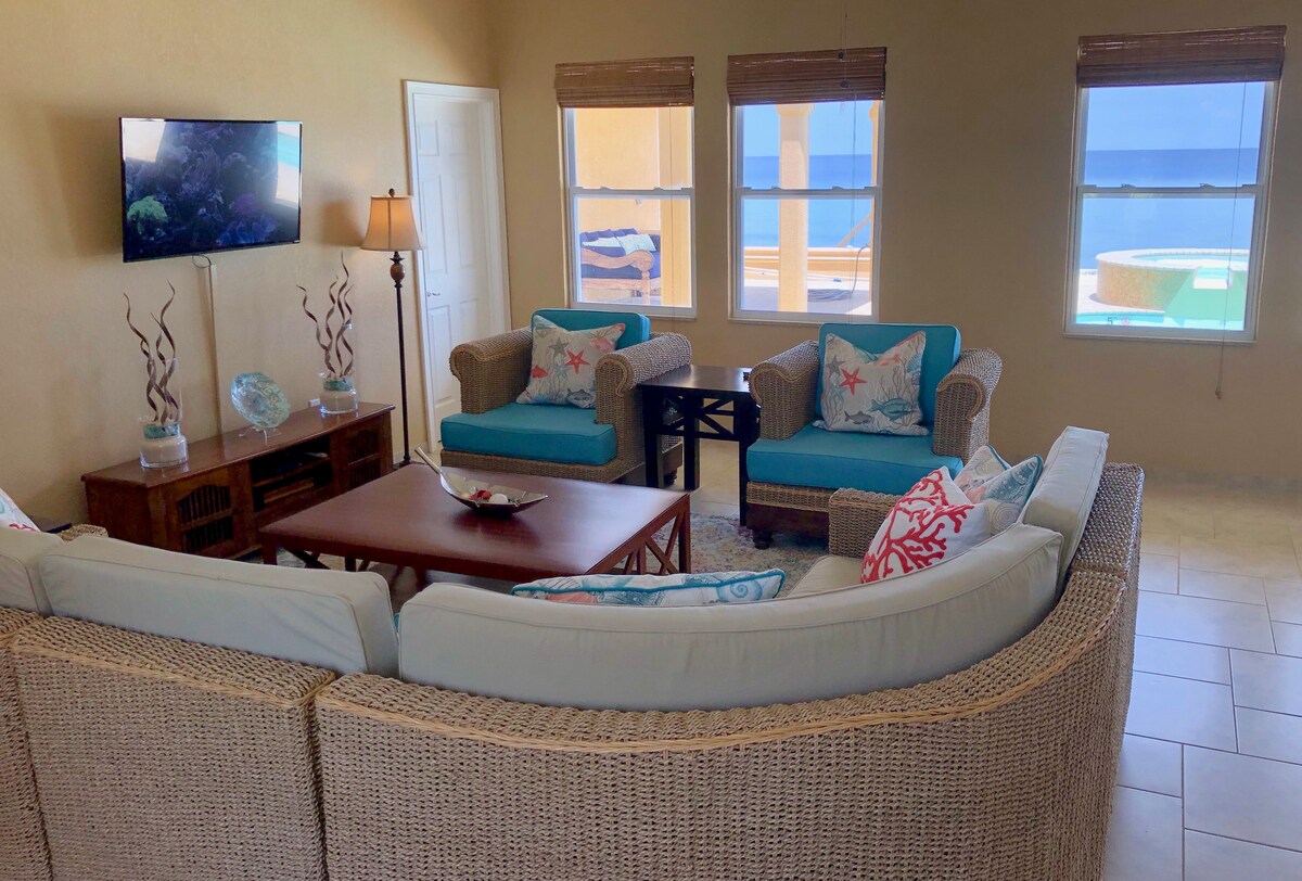 Despierta con las hermosas vistas al mar de Coral Beach Villa & Guest House, Cayman Brac. A solo 30 minutos en coche de Grand Cayman. Un sinuoso camino de entrada privado a través de palmeras y exuberante follaje tropical conduce a las 2 casas. Propiedad totalmente climatizada con capacidad para 2-10 personas en 4 dormitorios principales tamaño king, cada uno con baño privado. 2000 pies cuadrados de espacio en la cubierta con una hermosa piscina, cenador a la sombra y bañera de hidromasaje. Disfruta de suaves olas mientras paseas por la playa rocosa de coral al atardecer. La total y tranquila privacidad te espera.