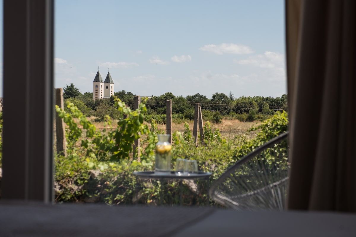Ubicada en el corazón de la naturaleza y rodeada de exuberantes viñedos, Villa Silente ofrece cuatro apartamentos elegantemente diseñados para huéspedes que buscan paz, silencio y el auténtico espíritu de Međugorje. Ya sea que estés de visita para reflexionar, descansar o explorar, este sereno refugio te invita a relajarte y reconectarte con lo que más importa. Disfruta de la tranquila belleza, las vistas panorámicas y la cálida hospitalidad.