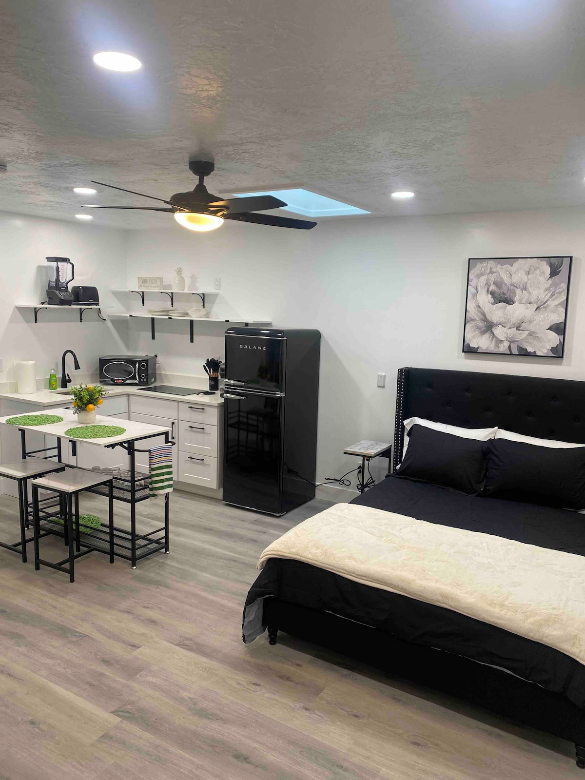 Bungalow de ladrillo de un dormitorio bellamente decorado. Disfruta de la sensación lujosa pero encantadora de la cocina gourmet personalizada con una gran isla, encimeras de cuarzo, combinación de armarios frontales sólidos y de vidrio, electrodomésticos inteligentes de acero inoxidable de primera línea, pregunta a Alexa direcciones, el clima o reproduce música y la pantalla wifi del refrigerador inteligente LG responderá. Baño de azulejos con ducha de vidrio europea, azulejos tipo metro, cabezal de ducha tipo lluvia con presión de agua óptima. Este alojamiento único tiene personalidad propia.