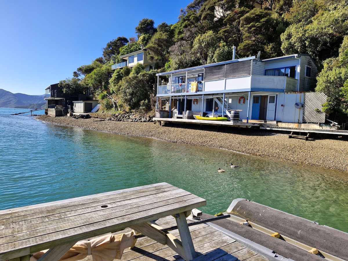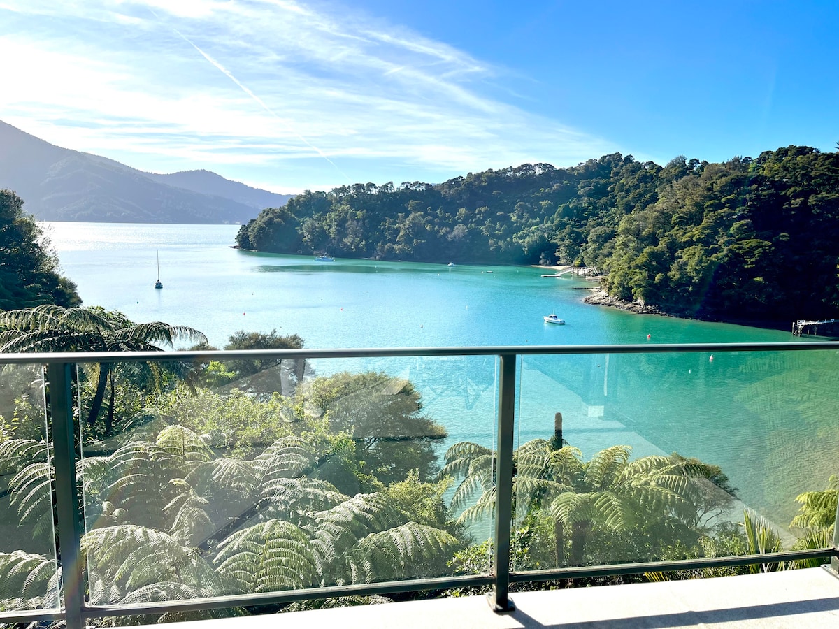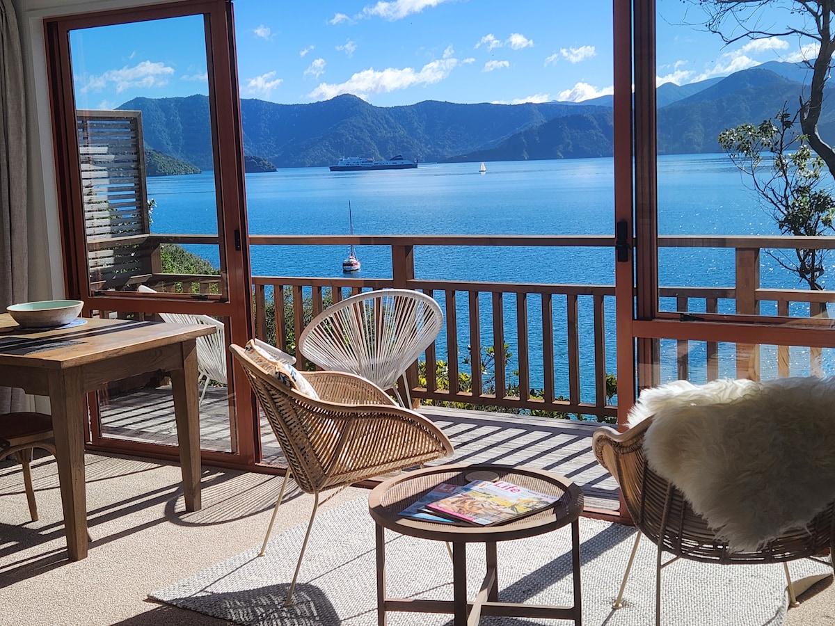 ¡Frente al mar! Nuestra exclusiva suite de invitados semiautónoma de la planta baja está frente a la playa en el pintoresco Marlborough Sounds. A solo 10 minutos en coche de Picton, donde el tren, el autobús o el ferry te conectan con la puerta de entrada de la Isla Sur o la Isla Norte. Sumérgete en la piscina del spa, relájate en una terraza con una copa de vino, utiliza los kayaks o la tabla de paddle surf o echa una caña de pescar a pocos metros de tu suite. Ubicación única justo a orillas del agua en el precioso Marlborough Sounds.