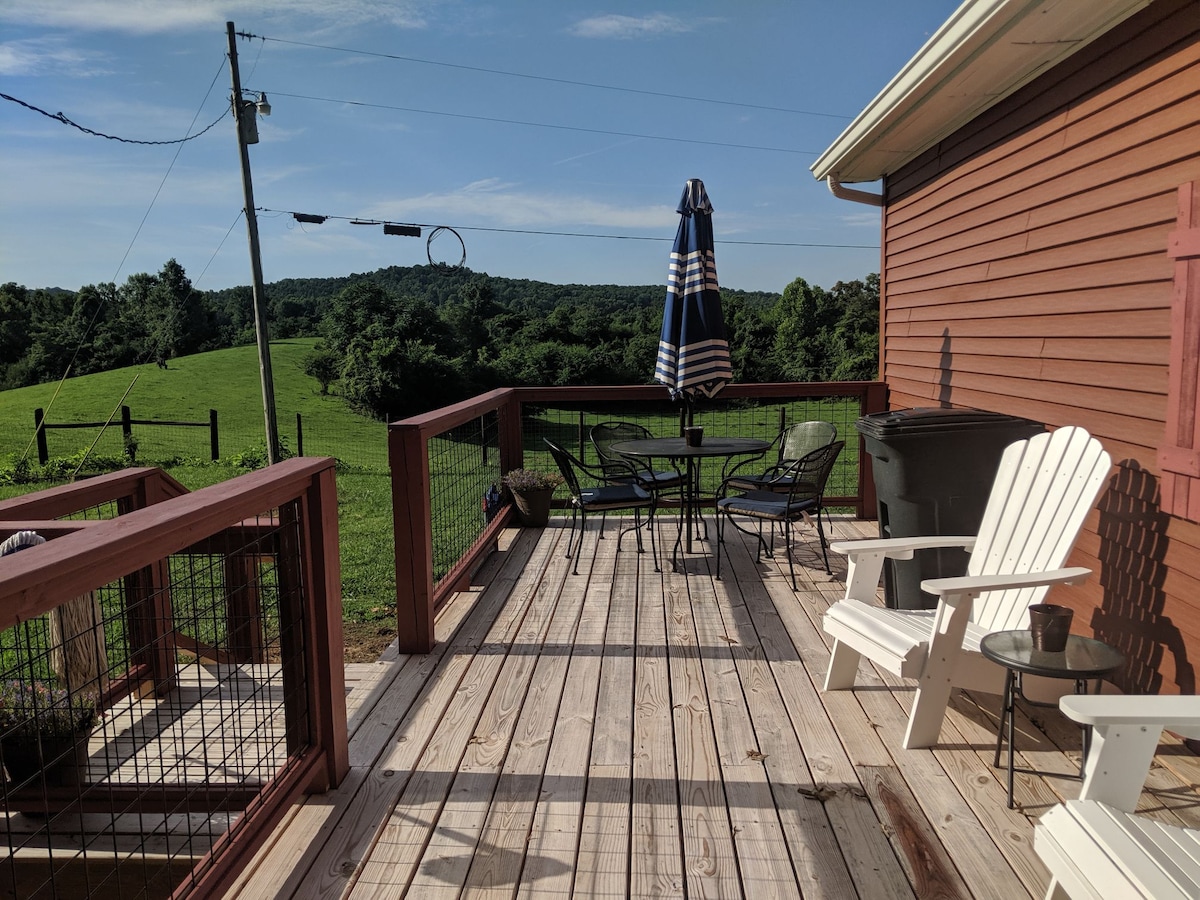 This studio apartment has its own private entrance that is attached to the cabin. The studio apartment and the cabin can be rented separate or for larger gatherings together. This studio apartment is everything you need for your next vacation! It is located in a quiet rural country area where you can see the stars at night and green pastures in the day. The cabin is located next door and is not included it is a separate. No third party bookings. Because of health issues, No animals, No smoking.