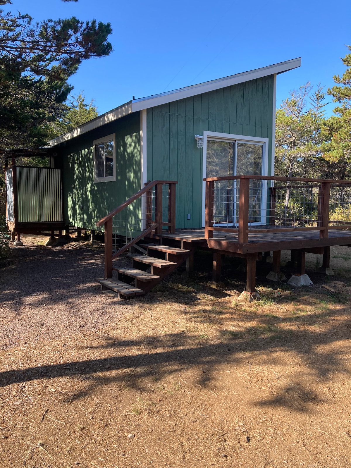 Cozy little guest shack looking out on giant redwoods at our sweet old homestead. Perfect stop on a road trip, just 1.5 miles from HWY 1 and endless coastal adventures. 🛏️ Indoors: Queen bed with cozy cotton flannel sheets, down comforter, and fluffy pillows, love seat, wood stove, pour over coffee set up, small cooler, books galore. *No kitchen* ✨No Wifi ✨ 🌲 Outdoors: hot shower with view of the redwoods and open sky, sink, composting toilet greenhouse bathroom about 30 steps from the cabin.