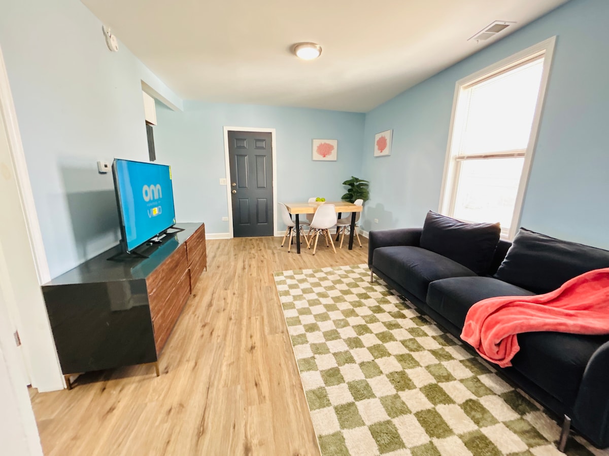 Relájate y desconecta en este alojamiento tranquilo y elegante. Estamos encantados de tenerte como nuestro huésped. Este apartamento se encuentra en el segundo piso (entrada desde las escaleras exteriores). Estamos a 30 minutos del centro de la ciudad (sin tráfico), a 4 minutos de Chicago Skyway y a 11 minutos de la Interestatal 94. Entra en tu espacio a través de tu propia entrada privada y siéntete como en casa. Tu unidad incluye 1 dormitorio privado, 1 baño, una cocina, sala de estar con sofá cama y escritorio.