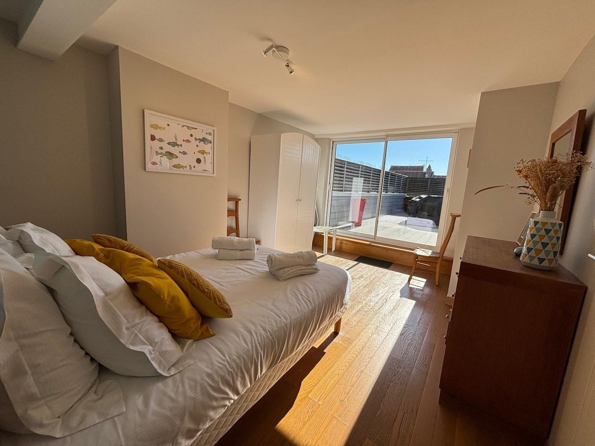 Accesible las 24 horas a partir de las 16:00. Casa de 50 m2 en pleno centro de la ciudad totalmente renovada en enero de 2022. Gran habitación de 20 m2, salón de estar de 25 m2 con cocina equipada Proporcionamos sábanas, toallas y café/té para el desayuno. Estamos totalmente disponibles (viviendo en la casa de al lado) para darle la bienvenida, aconsejarle o recibirle con una copa si lo desea.