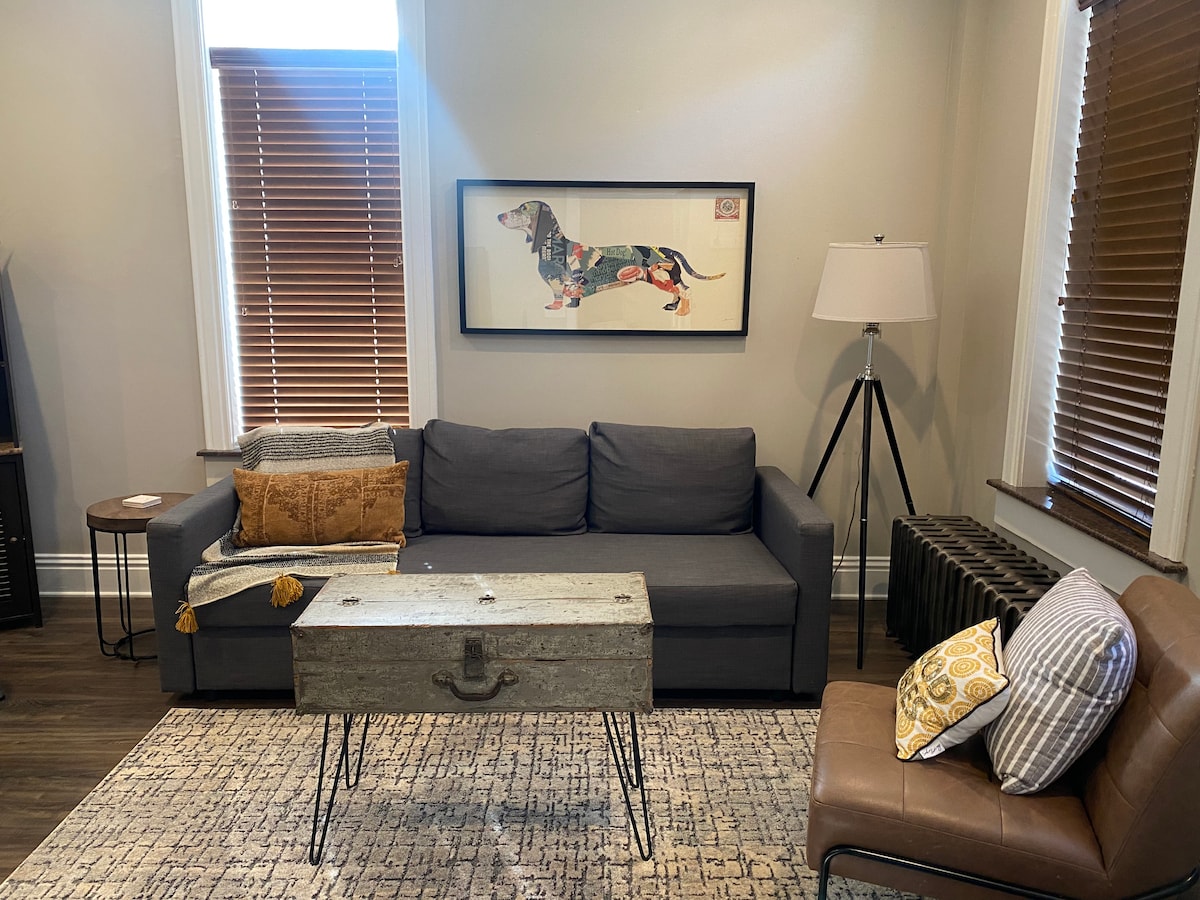 ¡Viaja como la realeza y alójate en The Queen Hotel, en el centro de Sturgeon Bay! Los colores vibrantes, el arte divertido, la cocina completa, la enorme ducha para dos personas y la espaciosa cama/sala de estar hacen de esta suite un refugio divertido y cómodo cuando no estás conquistando el condado. Cama tamaño king, TV inteligente, wifi rápido y muebles aterciopelados dan a la comodidad de la habitación que no se encuentra en ningún lugar del vecindario. La suite muestra el amor a Cher y la divertida decoración del hotel destaca a las mujeres y a la realeza por igual. Todo bienvenido, LGBQT+ amigable.