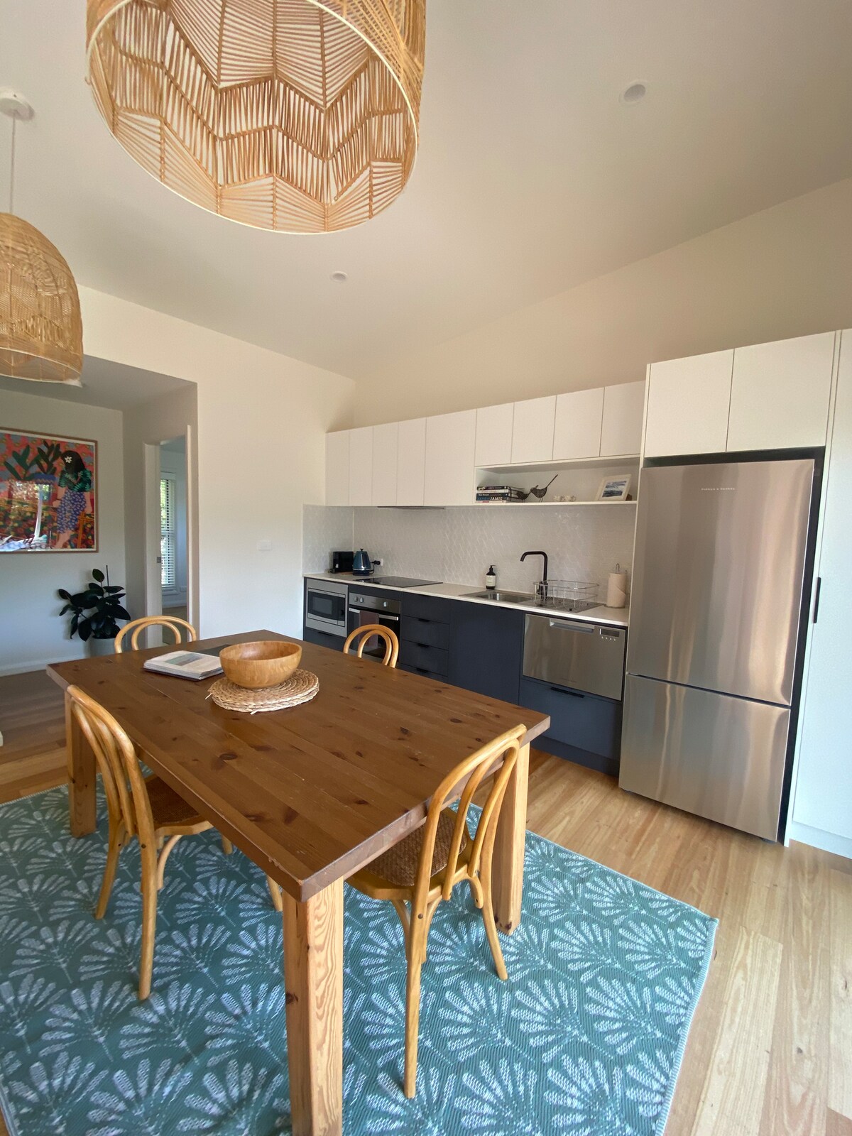 Barefoot at Callala Beach te ofrece una casa de playa con 2 dormitorios (el principal con amplias vistas al agua) diseñados por un arquitecto, sala de estar de planta abierta y cocina moderna con acceso privado directo a la playa de Callala, con todos los lujos y toques modernos para mimarte a ti y a tu amigo peludo. Es una escapada perfecta para una familia de 4 personas o una pareja que busca lo último en relajación y estilo. ¡Hay un grupo de delfines residentes en las tranquilas aguas de la bahía de Jervis para que puedas nadar con ellos!