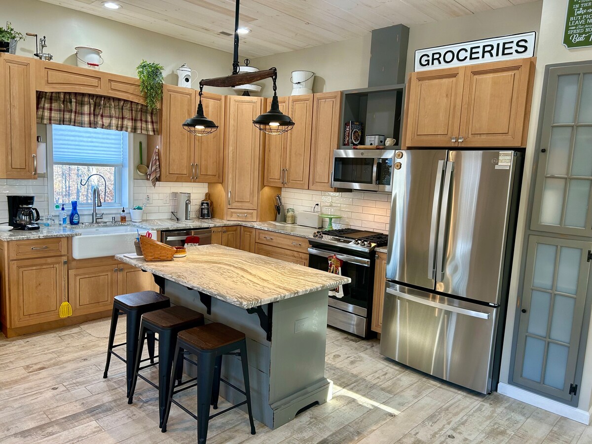 Nuestra casa de campo recién reformada se encuentra al borde de un bosque de árboles de madera dura gigantes. Disfruta de vistas a la montaña durante todo el año, incluida Merry Mountain. Relájate por la mañana mientras observas la vida silvestre desde una mecedora en el porche delantero. Visita bodegas locales, cervecerías, restaurantes, museos, tiendas, rutas de senderismo o lugares para bodas. Relájate en la hamaca o practica yoga en la terraza trasera. Prepara la cena en nuestra cocina de tamaño completo. Luego, contempla las estrellas alrededor del pozo de fuego después del anochecer. Este oasis de paz te espera.
