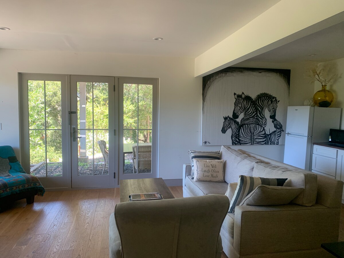 ¡Bienvenido a nuestra casa de 6 acres, High Ground, y ten nuestra casa de carruajes apta para niños y mascotas para ti solo! El gran apartamento tipo estudio con entrada independiente tiene unas vistas impresionantes de los antiguos árboles de secuoya y de la bahía/monte Diablo. Rutas de senderismo inmediatas, vida silvestre, a minutos de: restaurante de Alice (5), Village Pub con calificación Michelin (15), autopista 280 (15), Palo Alto/Menlo Park/Half Moon Bay/Ocean (30), SFO (35), San Francisco (45). Perfecto para un retiro en el norte de California, negocios en el valle o hacer turismo en San Francisco.