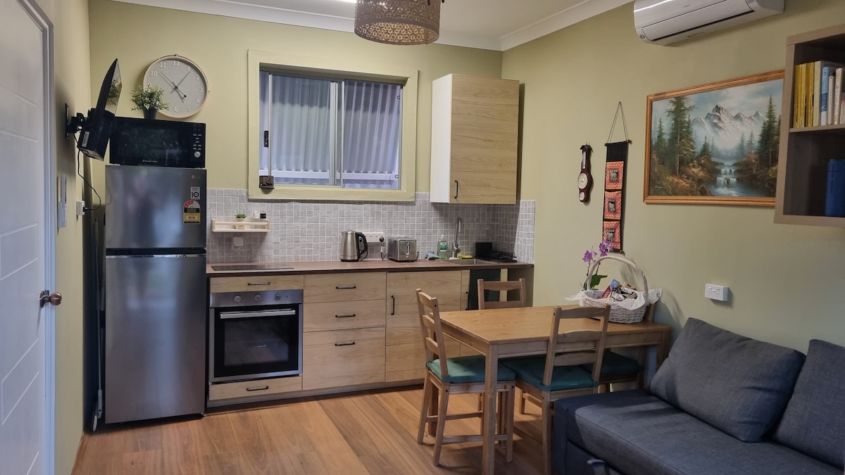 Hermoso apartamento privado grande e independiente adjunto a la casa principal, con entrada y patio propios. Cuenta con una gran sala de estar de planta abierta, con TV, Netflix y Stan. Una pequeña cocina y comedor y un dormitorio y baño separados. La cocina americana tiene una nevera/congelador grande, una placa de inducción, microondas, sartén eléctrica, freidora de aire, cafetera Nespresso y tostadora. No cuenta con horno. El dormitorio tiene una cama tamaño queen de calidad y ropa de cama. El baño tiene bañera de tamaño completo y ducha.